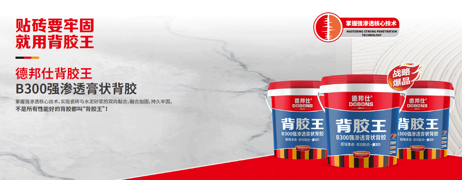 德邦仕品牌缘起于1968年德国鲁尔区的一间建材实验室由热衷于技术发明的德国人凯比德·德邦仕(Kebede·Dobons)先生带领多位科学家历经6年时间研究出来一种新型的“双向渗透粘结材料”,这种具备强渗透粘结能力的材料贴砖不脱落,粘结力持久有效;在欧洲市场得到广泛应用。2013年3月公司在武汉设立生产基地,并注册了武汉德邦仕建材有限公司。产品种类丰富,涉及面广,公司生产的产品有:防水材料、路桥系列、瓷砖背胶系列、修缮系列、堵漏系列、美缝填缝系列、瓷砖胶系列......