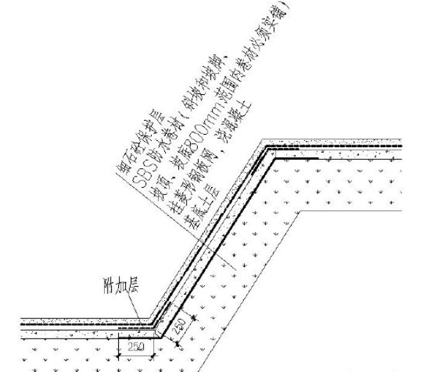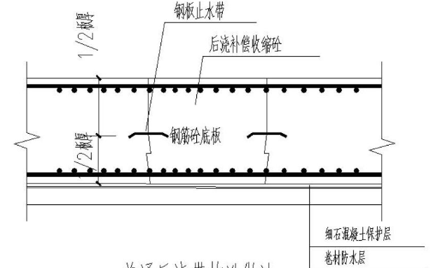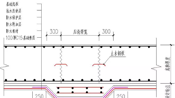 ① 当地下水位高于基础底板时,在基础垫层施工时,应在后浇带设置抗水压垫层,施工方法如图/所示。② 抗水压垫层应单独浇筑,混凝土等级应与基础底板相同。③ 防水卷材的附加层应布置在防水垫层下,两侧超过250mm④ 这个位置的每一层的顺序是:基础→ 坐垫→ 防水层→ 防水附加层→ 抗水压垫层→ 底板;如果节点方法与设计不一致,以设计为准[Picture