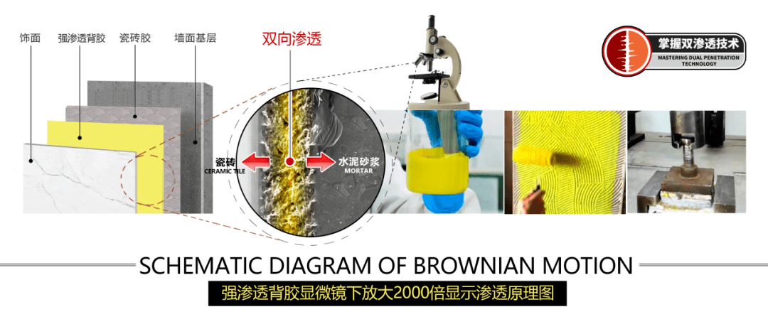 使用渗透性极强的环氧改性聚粘材料和柔性高聚物乳液作为主要粘结物。环氧改性聚粘材料是一种带有蓝紫色光泽的乳白色水分散体,具有较高的粘结力和结膜强度,机械及化学稳定性好,流动性好、贮存稳定性均佳等优点,并且具有极细的胶乳粒径,所以具有双向渗透性,能渗透到混凝土里层和瓷砖里层。砂浆中混入柔性高聚物胶乳能起填充空间的作用,形成连续凝胶,在混凝土界面形成很强的机械锚锢力。同样高聚物乳液渗透到瓷砖里层后跟瓷砖界面形成机械锚锢力,达到无缝咬合。