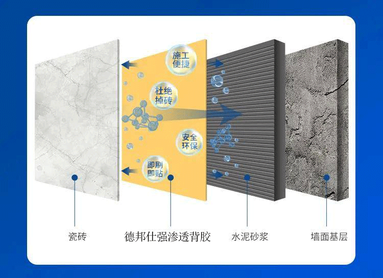 其次,德邦仕强渗透膏状背胶具有很高的渗透性,能够深入到瓷砖毛细孔中形成无数个不规则的粘结点,形成织网状结构,从而具有很强的粘结力和拉拔系数;而乳液背胶则只是采用单纯的物理粘结原理,粘结力较弱,容易受到外力的影响而出现松动或脱落。